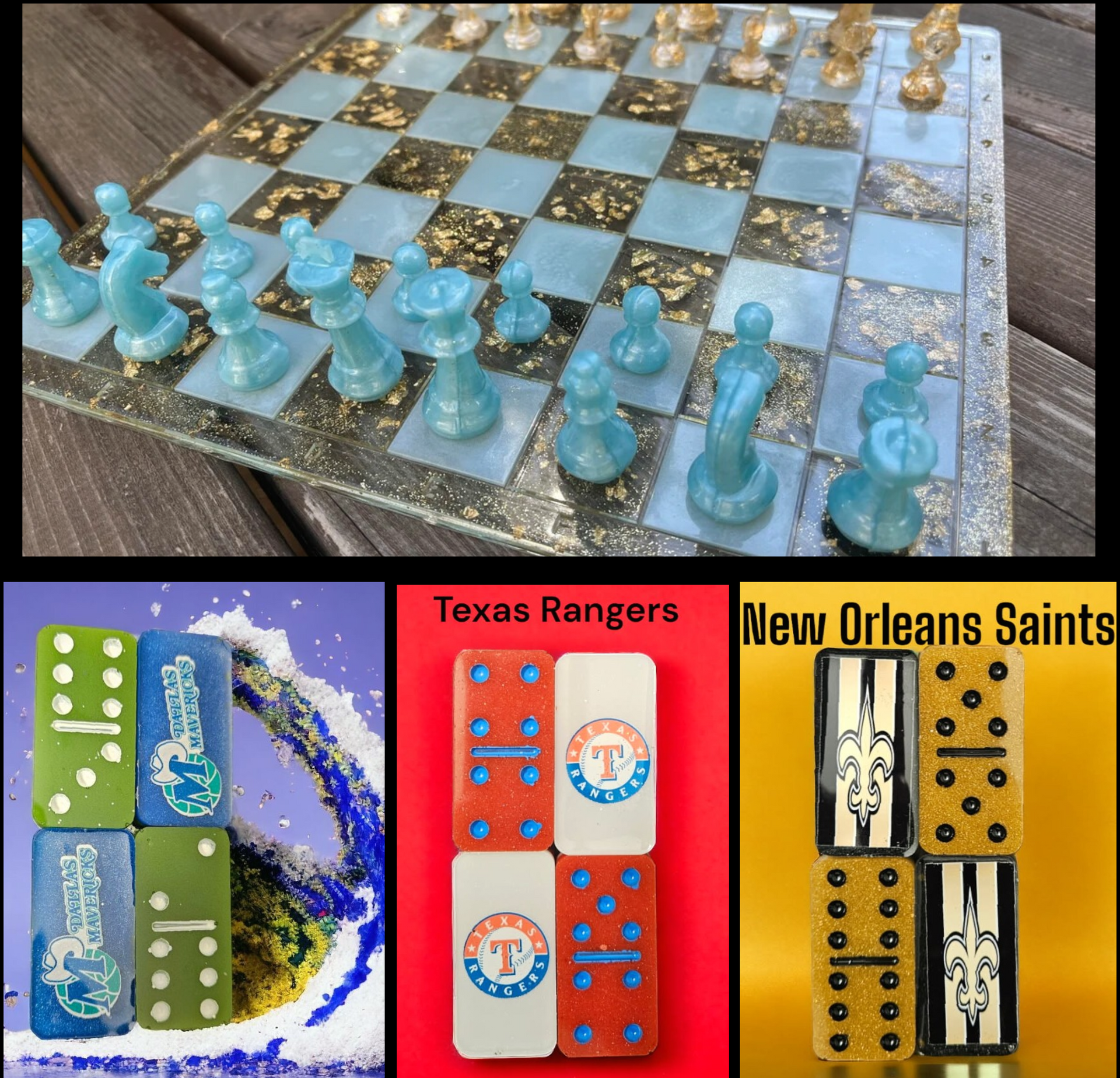 Custom resin chess sets designed with bold colors, metallic finishes, or personalized details. Ideal for gifting, décor, or collectors.